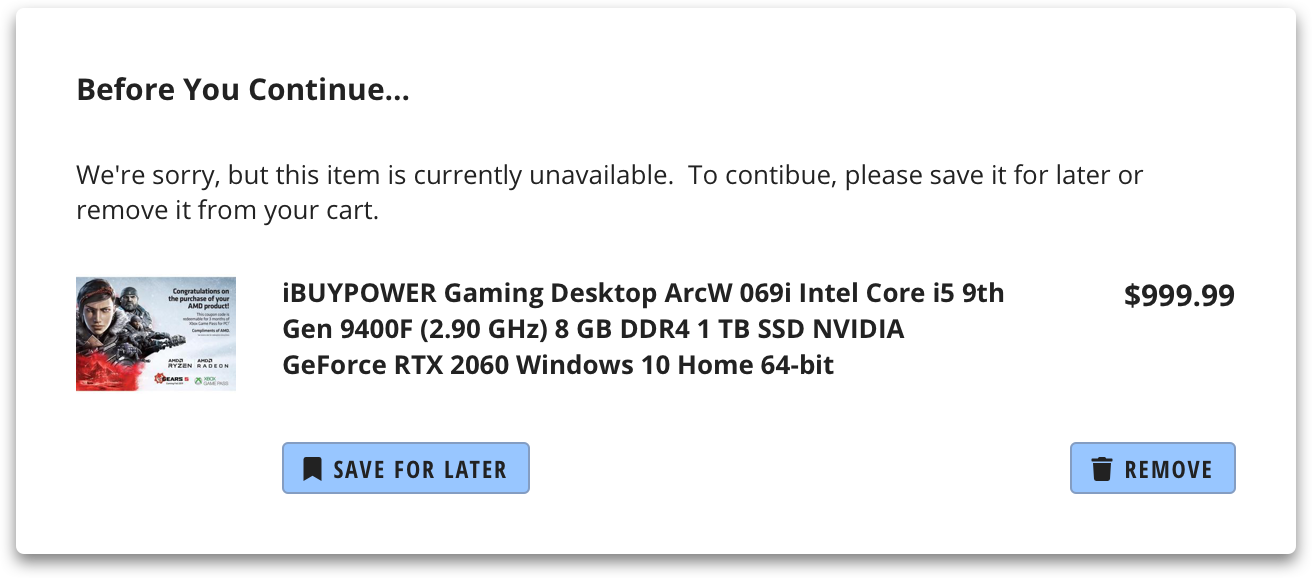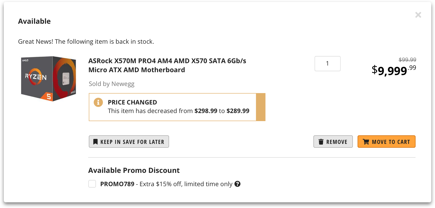 This popup window notifies customers when the item that was unavailable and moved to their Save for Later section is back in stock.  Customers can move it to the cart, still keep it in the save for later section, or remove it.