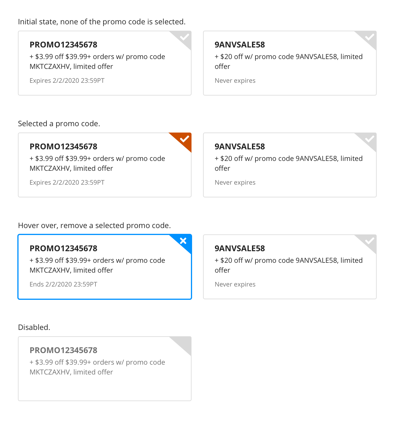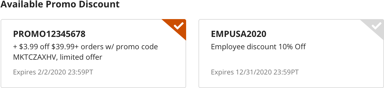 • Added the promo code section which consolidated all the promo code from either email promotion, site wide discount, or account specific benefits. Customers can compare and select one with the most discount.