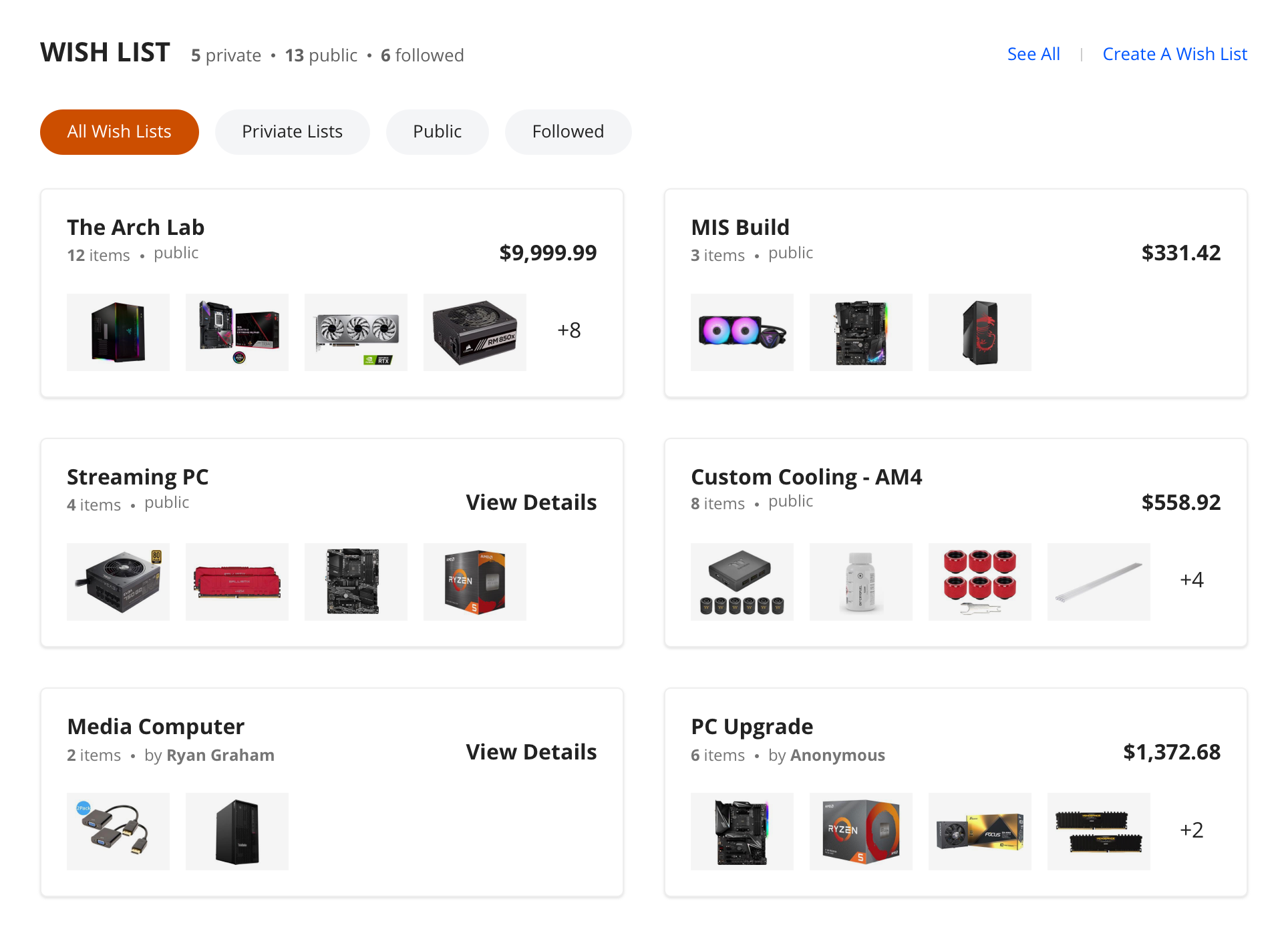Mobile size example. A group of the PC Builder lists that the user has been shared.